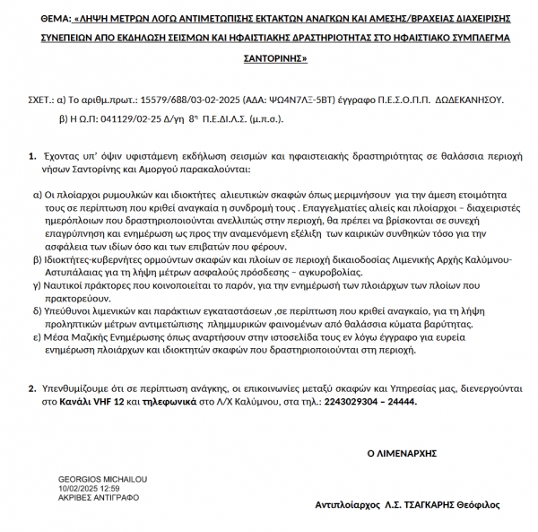 Ανακοίνωση του Λιμεναρχείου Καλύμνου