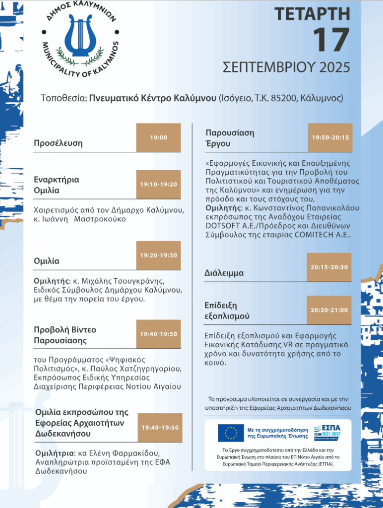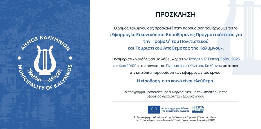 Πρόσκληση και ενδεικτικό πρόγραμμα παρουσίασης του έργου “Εφαρμογές Εικονικής και Επαυξημένης Πραγματικότητας για την Προβολή του Πολιτιστικού και Τουριστικού Αποθέματος της Καλύμνου”